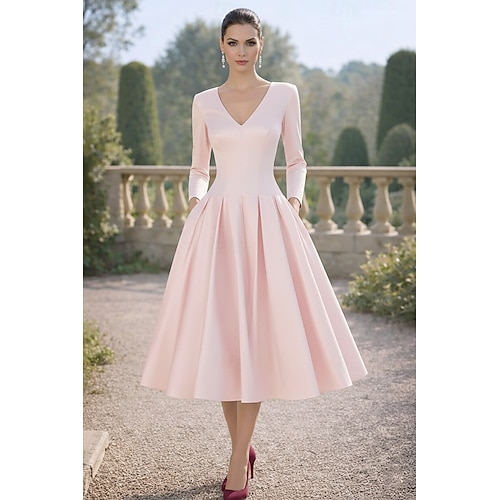 Linea ad A Lunghezza Tè Abiti da Cocktail Elegante Quotidiano Abiti semi formali Manica 3/4 Scollo a V Festa in giardino Matrimonio Raso con Pieghe
