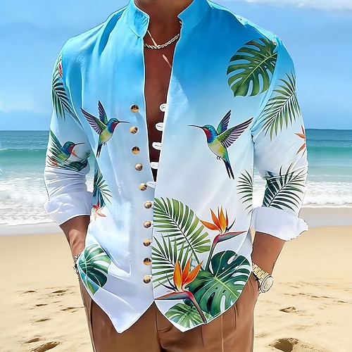 Herren Papagei Farbverlauf Palmblatt Hawaiihemden Alohahemd Stehkragenhemd Langarm Hawaiianisch Strandurlaub Sommer Frühling Mandarinkragen Stehkragen Button-Down Leinenähnliches Hemd Blau