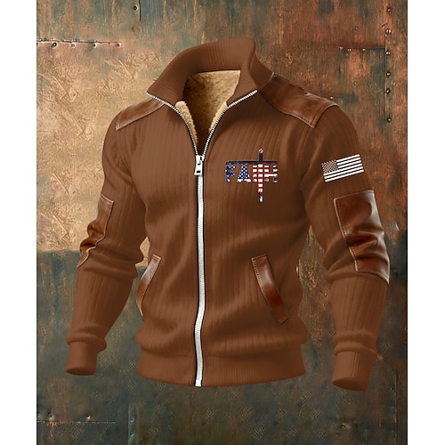 Per uomo Felpa con cappuccio a zip intera Giacca in Pile Felpa con cappuccio in pile Nero Bianco Verde militare Blu marino Marrone Colletto Mao Croce Bandiera Americana Fede Tasca Dettagli in