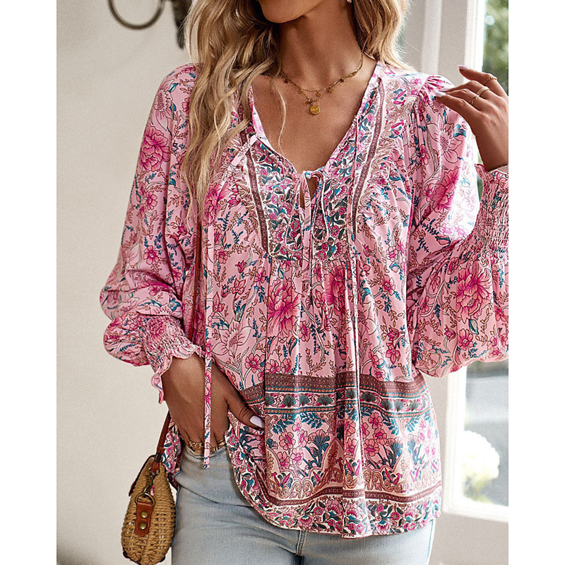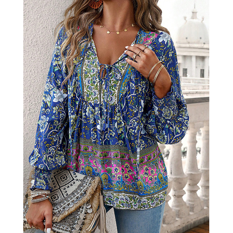 Women's Boho Shirt Blouse Flower Modern Boho Long Sleeve V Neck Regular Tops Daily Going out Print Yellow Pink Navy Blue Blue Orange Summer