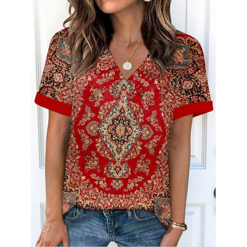 Women's T Shirt Floral Graphic Paisley Bohemia Vintage Stylish Short Sleeve V Neck Regular Tops Daily Going out Weekend Print Black Pink Red Blue Orange Summer Spring