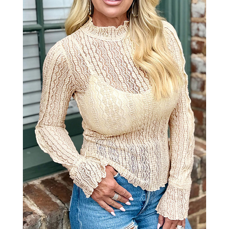 Women's Blouse Dressy Tops Lace Tops Solid Color Plain Elegant Vintage Ladies Long Sleeve Crew Neck Regular Tops Daily Work Holiday Ruched Lace Patchwork Beige Fall Winter