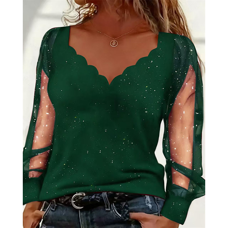 Women's Blouse Dressy Tops Plain Elegant Vintage Ladies Long Sleeve V Neck Regular Tops Daily Work Holiday Ruched Patchwork Glitter Blue Black Wine Purple Green Spring Fall