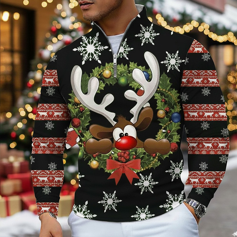 Christmas Men's Elk Polo Long Sleeve Polo Shirts Grandad Collar Casual Holiday Daily Wear Festival Outfit 3D Print Quarter Zip Polo Spring Fall Winter Black Red Green