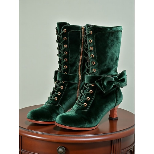 stivali alti fino al ginocchio da donna in velluto verde con lacci e fiocco – stivali con tacco ispirati al vintage anni '20 per carnevale e feste