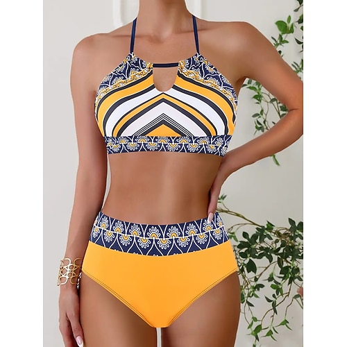 Women's Bikini 2 Piece Swimsuit Colorblock Briefs Slim Backless Vacation Beach Wear Geometric Color Block Halter Neck Sleeveless Bathing Suits