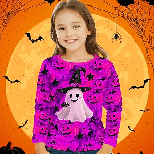 Halloween Mädchen 3D Kürbis Geist T-Shirt Langarm Frühling Herbst Mode Basic Kinder 4-12 Jahre Rundhalsausschnitt Outdoor Lässig Täglich Normale Passform