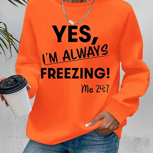 Felpa con fodera in pile da donna, pigiama, sì, ho freddo, lettera, streetwear, casual, manica lunga, girocollo, regular, per le feste, per uscire, stampa, nero, rosso, arancione, verde, grigio scuro