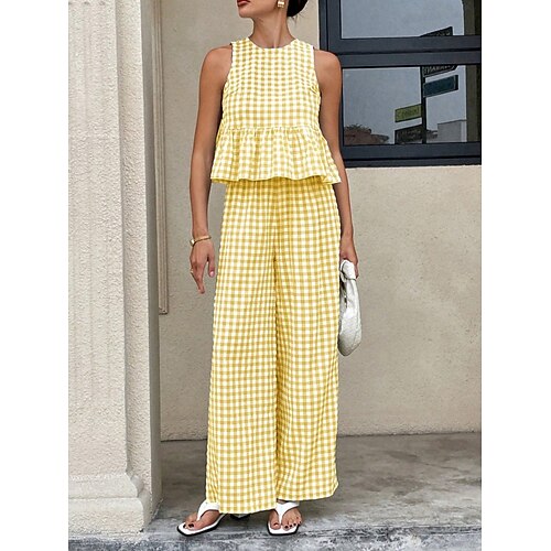 Per donna Set di Pantaloni Bolero Top Senza Maniche Girocollo Plaid Volant Moda Streetwear Casuale Quotidiano All'aperto Blu Nero Giallo Estate Vestibilità regolare