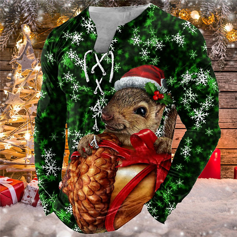 Christmas T Shirt Men's T shirt Tee Tee Graphic Squirrel Collar Green Blue Red 3D Print Outdoor Christmas Long Sleeve Lace up Print Clothing Apparel Basic Designer Casual