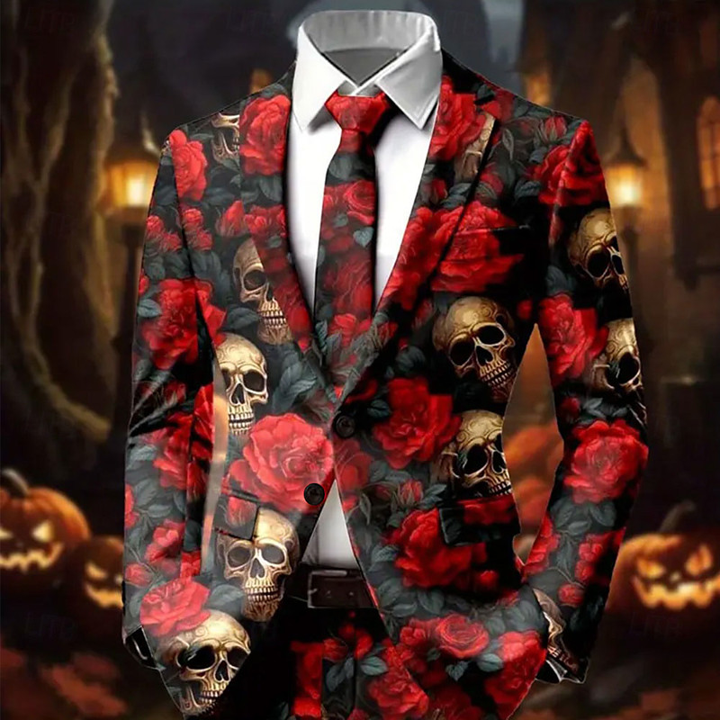 Halloween Men's Coat Blazer Street Casual Festival Fashion Casual Daily All Seasons 100% Polyester Cool Skulls Rose 3D Print Buttons Comfortable Single Breasted Blazer Red Blue Green Rose Red