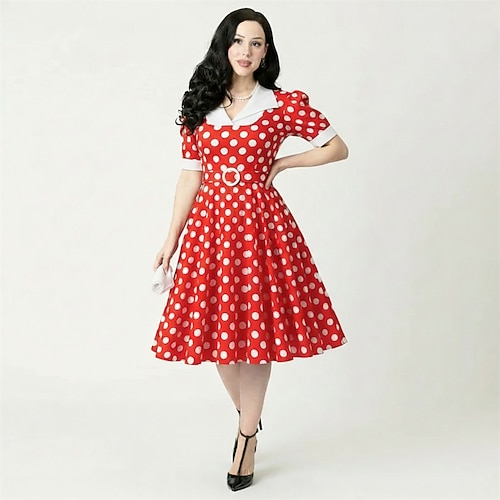 Retrò Vintage Anni 1950 Hepburn Midi Vestito Abito a trapezio Vestito Svasato Maniche corte Pois Aderente Svasato Costume Per donna Carnevale San Valentino Casuale Ritorno a casa Festa a tema retrò