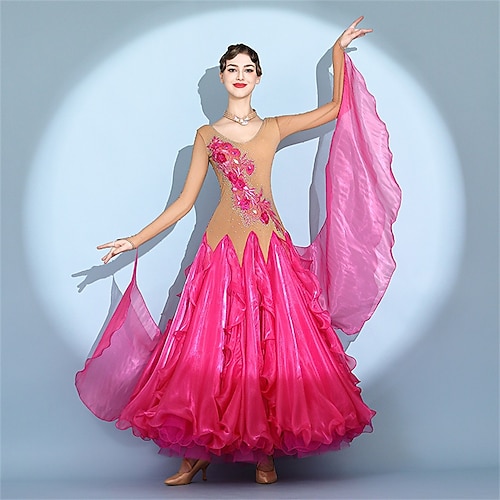 abito da ballo da sala da donna, elegante abito da competizione in tulle a strati con ricami floreali e strass, per valzer, tango, foxtrot – rosa