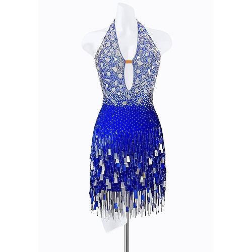 abito da ballo latino da donna con frange in strass blu argento - scollo all'americana effetto sfumato per spettacoli da ballo asimmetrici