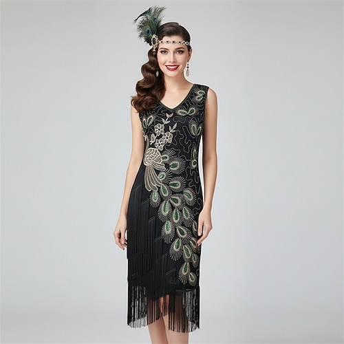 Set Anni Ruggenti Anni 1920 Abito da cocktail Lunghezza al ginocchio Abito Flapper Vestito Abiti con accessori Senza maniche Il grande Gatsby Charleston Paillettes Frangia con nappe Piuma Scollo a V