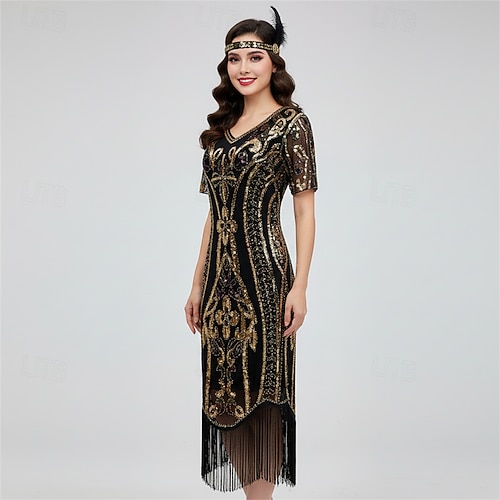 Retrò Vintage Anni Ruggenti Anni 1920 Lunghezza al ginocchio Abito Flapper Maniche corte Il grande Gatsby Ragazza Flapper Paillettes Frange Tubino / Colonna Scollo a V Costume Per donna Natale