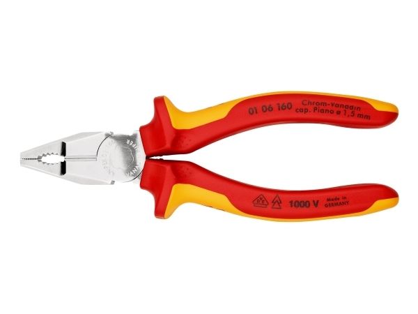 Knipex 01 06 160, Lineman''s tænger, Stødbestandig, Dielektrisk, Krom-vanadium-stål, Plast, Orange, Rød, 55 mm