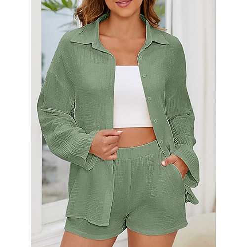 Per donna Set da due pezzi Camicia di cotone Set di Pantaloncini Manica Lunga Colletto a Camicia Semplice Moda Streetwear Casuale Quotidiano All'aperto Bianco Rosa Verde militare Estate Vestibilit