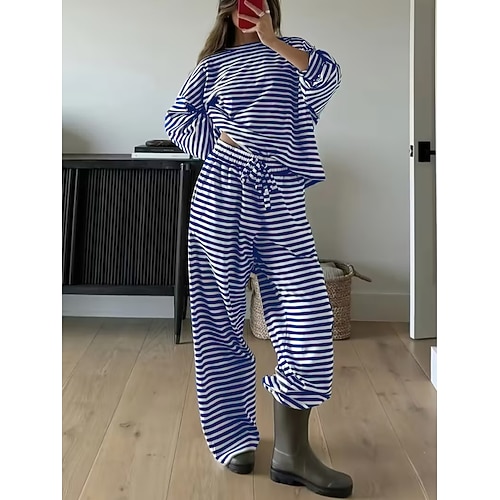 Per donna Tuta Set di Pantaloni Manica Lunga Girocollo A righe Elegante Moda Streetwear Casuale Quotidiano All'aperto Blu Nero Rosso Estate Vestibilità comoda