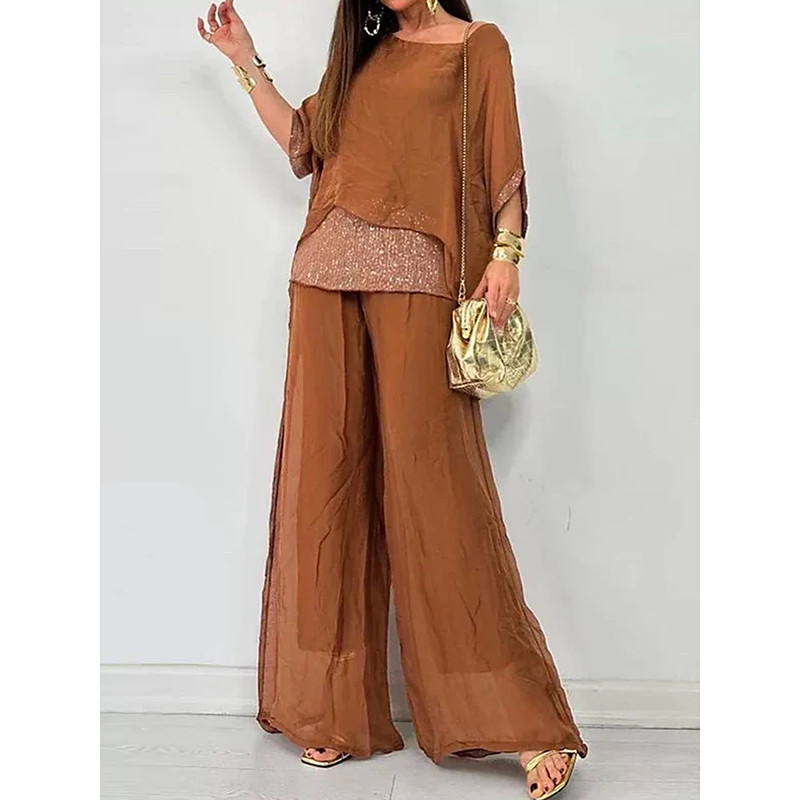 Women's Elegant Fashion Blouse Pants Trousers 3/4 Length Sleeve Round Neck Solid Color Sequins Mesh Work Daily Black Purple Brown Summer Loose Fit