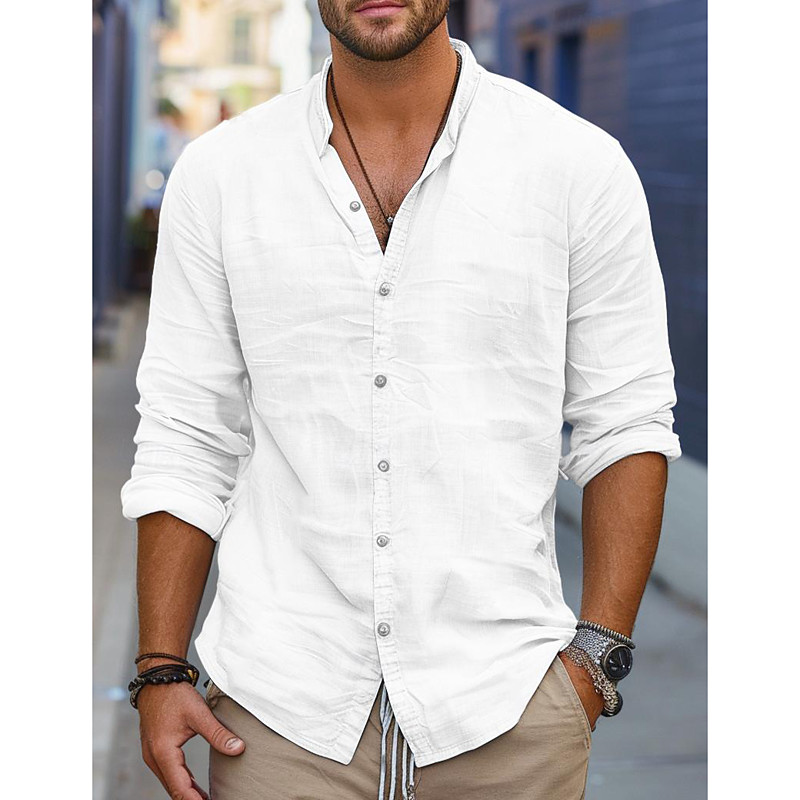 Men's Shirt Band Collar Shirt Summer Shirt Beach Wear Button Up Shirt Plain Casual Daily White Blue Long Sleeve Band Collar Spring Summer Clothing Apparel