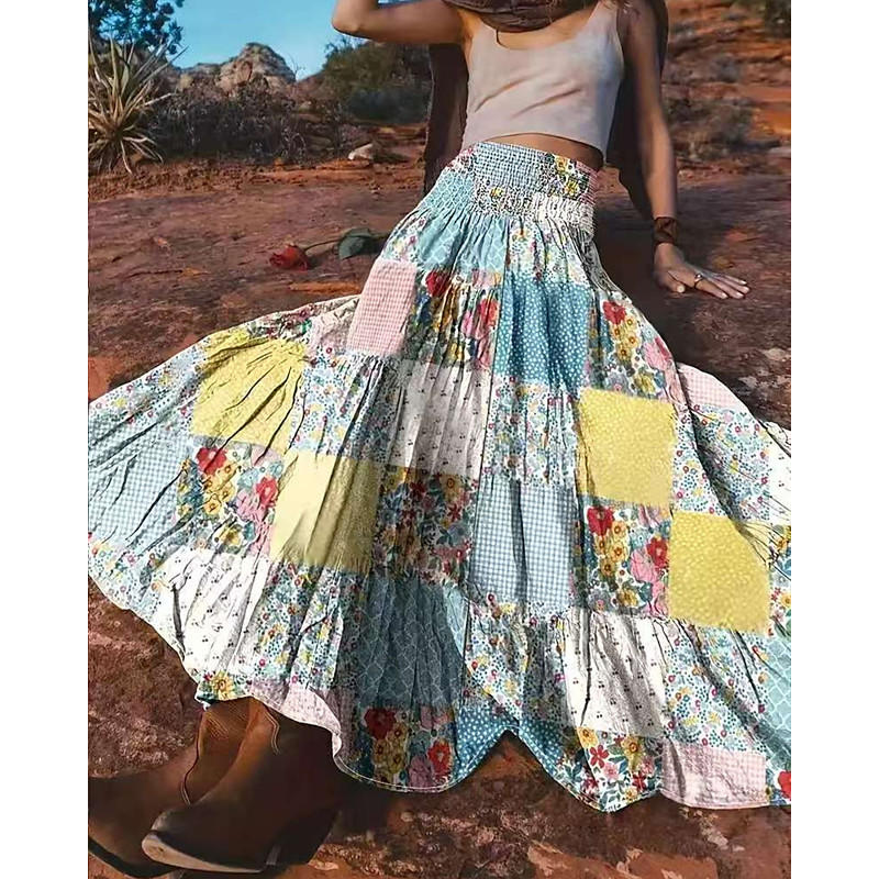 Women's Skirt Swing Casual Boho Maxi Mid Rise Skirts Floral Plaid Patchwork Print Micro-elastic Vacation Street Blue Spring Polyester