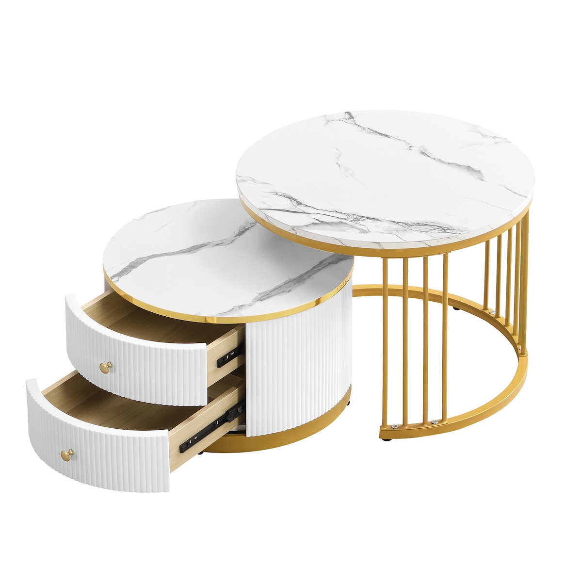 OKWISH Couchtisch-Set 2-teilig rund MDF Weiß 45x60x60+50x50x32 cm modern Wohnzimmer Tisch hochglanz Marmoroptik Stauraum flexibel