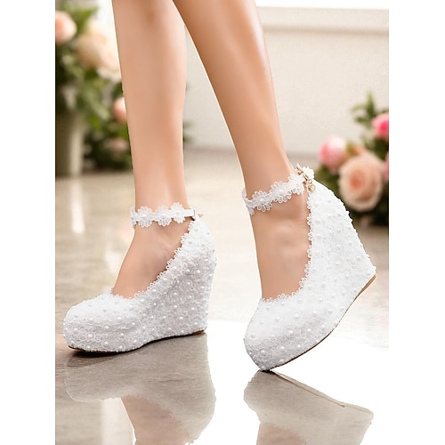 Hochzeitsschuhe mit Keilabsatz für die Braut – weiße Plateau-Schuhe mit Spitze und Perlenbesatz, Knöchelriemen, bequeme Brautschuhe für Zeremonie und Empfang