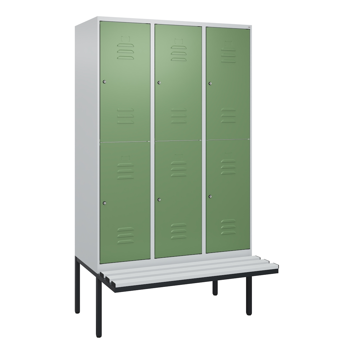 C+P Spind Classic PLUS, Kunststoff schwebende Sitzbank, 6 Abteile, HxBxT 212x120x82cm, Zylinderschloss, Hellgrau/Resedagrün von PROREGAL