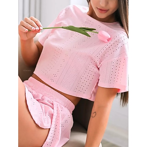 Per donna Set Pigiama Casual Comfort Colore Puro Elastico in vita Foro Shorts Quotidiano Casa Manica Corta Girocollo Blu Nero Bianco Rosa Viola Estate Primavera Vestibilità comoda