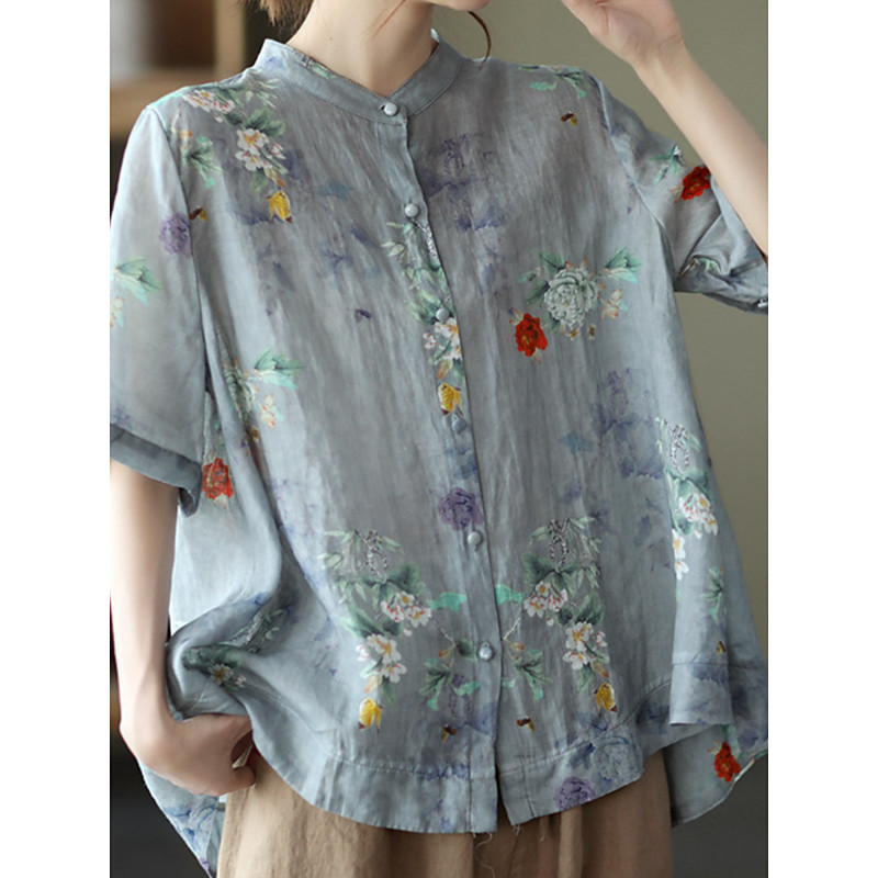 Women's Blouse Floral Stylish Casual 3/4 Length Sleeve Mandarin Collar Regular Tops Daily Embroidered Buttons Purple Summer Spring
