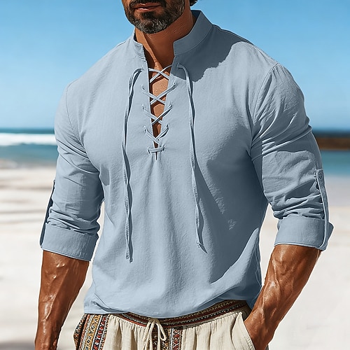 Per uomo Camicia Stile vichingo Camicia Estiva Abbigliamento da spiaggia Camicia pirata Tinta unica Casuale Vacanza Bianco Blu marino Azzurro cielo Verde Manica Lunga Collo alla coreana Estate