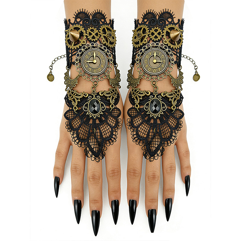 Women's Mardi Gras Steampunk Victorian Lace Fingerless Glove Bracelet - Alloy Clock and Gear Accessory for Carnival Halloween Costume