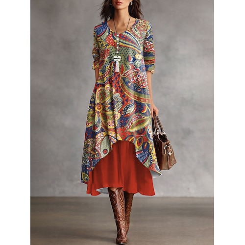 Per donna Abito Midi Vestito Casual Abito Stampato Vintage africano Quotidiano Spiaggia Weekend Vestibilità regolare Floreale Manica 3/4 Girocollo Rosa Rosso Fucsia Verde Autunno