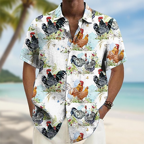 Herren Tiermotiv Hahn Lustig Sommer Hawaiihemd Knopfhemd Alohahemd Kurzarm Hawaiianisch Urlaub Strandbekleidung Sommer Frühling Umlegekragen 3D-Druck Hemden mit Kragen Weiß Rote
