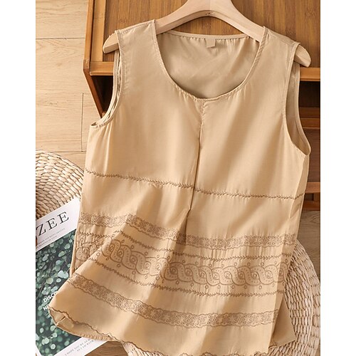 Damen Weste aus Baumwollleinen Sommeroberteile Bluse Einfarbig Elegant Damen Stilvoll Ärmellos U-Ausschnitt Normale Oberteile Täglich Arbeit Ausgehen Gerafft Patchwork Bestickt Weiß Champagner Rosa