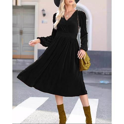 Per donna Abito Midi Abito arricciato Moderno Quotidiano All'aperto Uscire Vestibilità regolare Semplice Manica Lunga Scollo a V Nero Vino Viola Marrone Primavera Autunno
