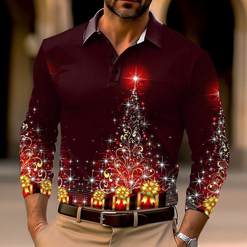 Christmas Men's Christmas tree 3D Polo Tree Casual Golf Long Sleeve Outdoor Casual Daily Streetwear Fall Winter 3D Print Turndown Wine Blue Dark Green Micro-elastic Polyester