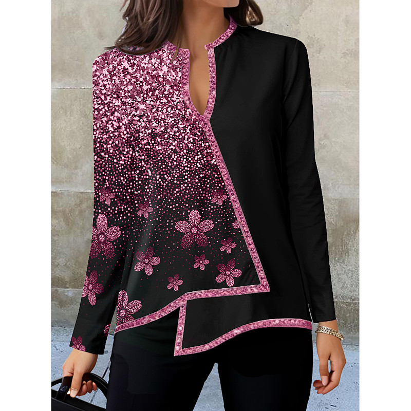 Women's 3D Print Blouse Long Sleeve Asymmetrical Hem Fashion Floral Print Asymmetric Hem Regular Tops V Neck Casual Holiday Black Silver Pink Blue Green Fall Winter