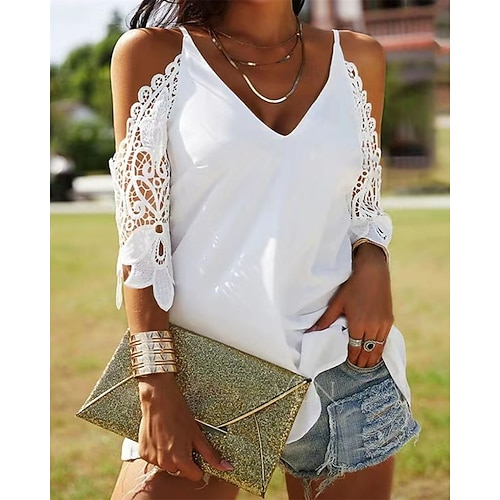 Per donna Top estivi Blusa Top Eleganti Tinta unica Semplice Elegante Vintage Quotidiano Manica 3/4 Scollo a V Top Regolari Quotidiano Lavoro Ferie Arricciato Pizzo Patchwork Bianco Estate Primavera