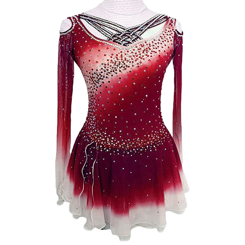 Figure Skating Dress Women's Girls' Ice Skating Dress Red Patchwork Open Back Mesh Spandex Stretchy Training Practice Professional Skating Wear Thermal Warm Crystal / Rhinestone Long Sleeve Ice
