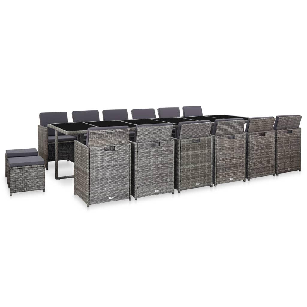 Udendørs spisebordssæt med hynder 17 dele polyrattan grå
