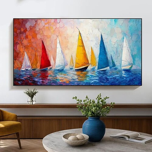 dipinto a olio astratto fatto a mano di barca a vela, dipinto a mano, arte murale nautica colorata, arredamento moderno per la casa, grande opera d'arte su tela, dipinto di un paesaggio marino