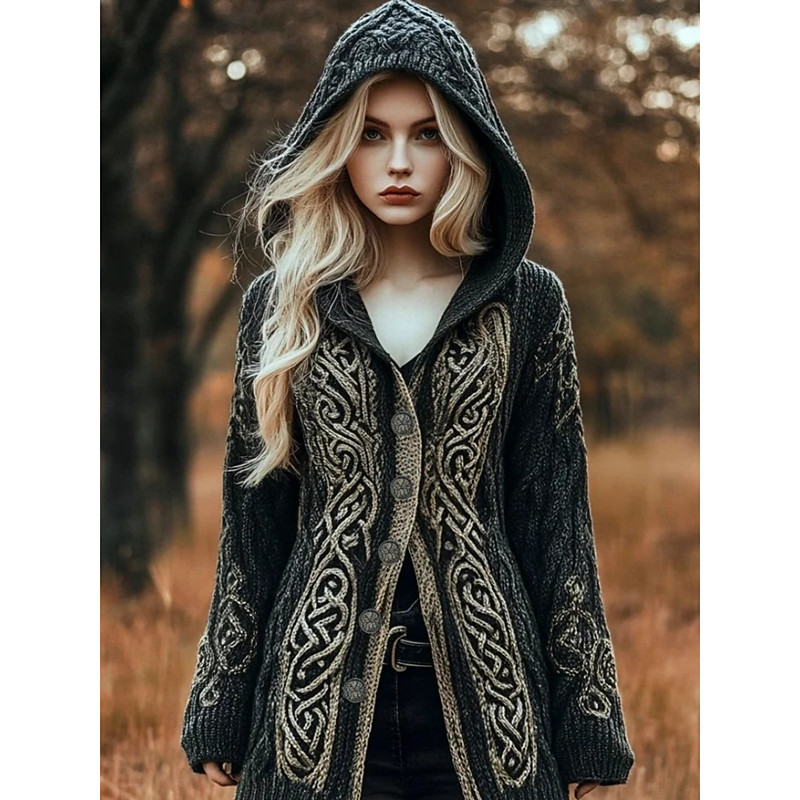 Women's Vintage Viking Cardigan Daily Casual Graphic Geometric Ribbed Hooded Patchwork Pocket Buttons Long Sleeve Long Tops Knit Outdoor Weekend Black Fall Winter