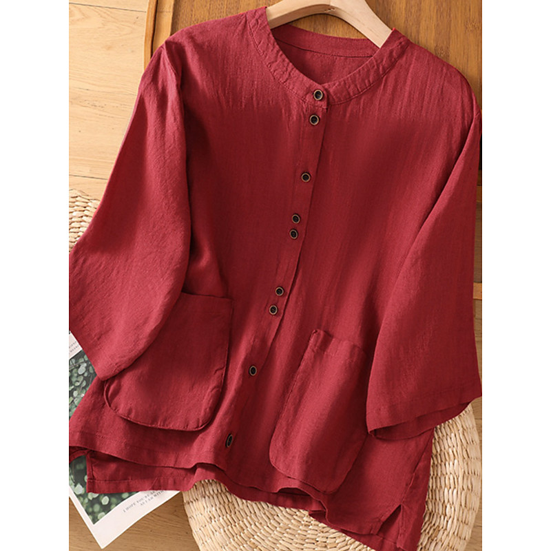Women's Cotton Linen Shirts Solid Color Basic Casual 3/4 Length Sleeve Crew Neck Regular Tops Daily Pocket Buttons White Wine Green Khaki Summer Spring Fall