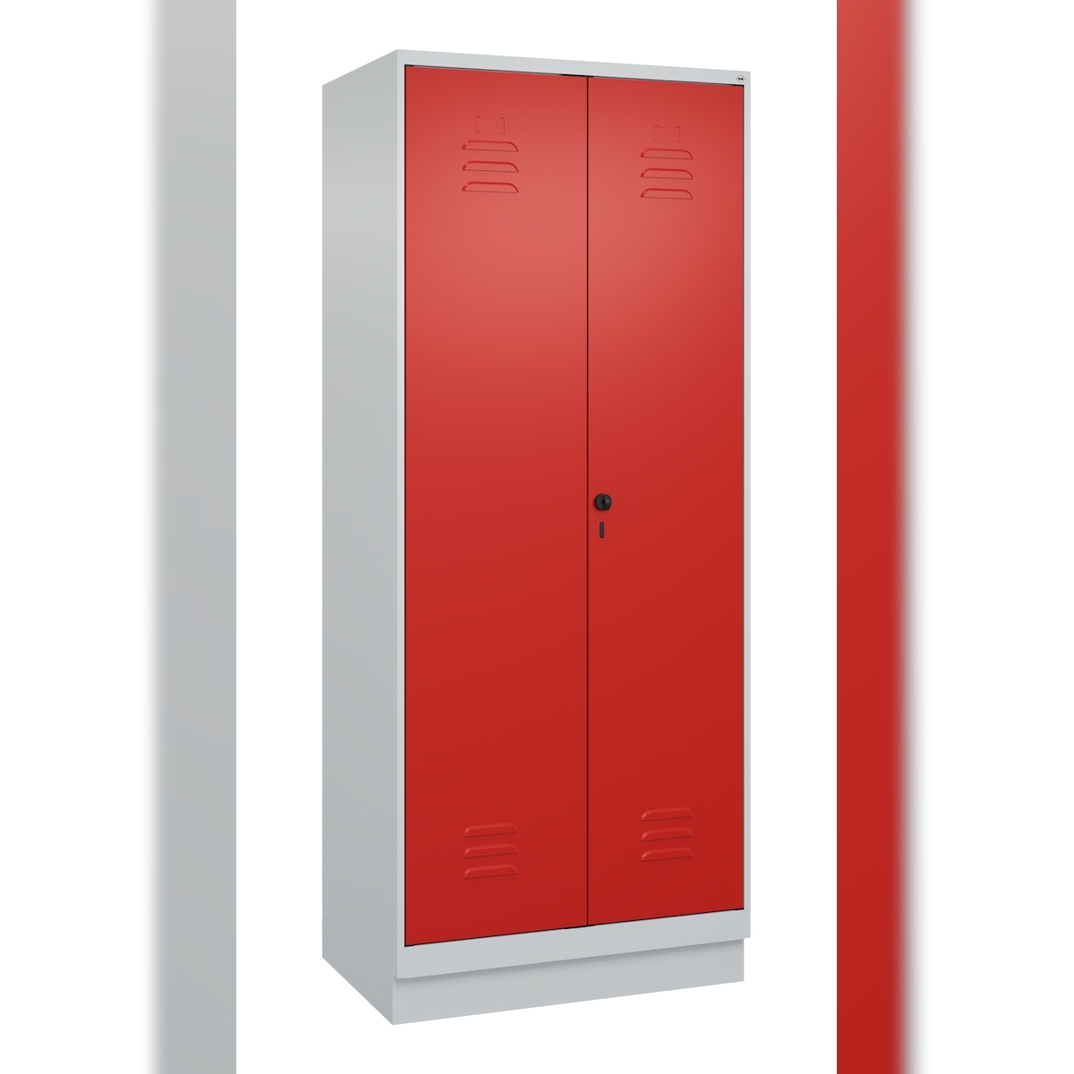 C+P Aufbewahrungs Doppel-Spind Classic PLUS, Sockel, 2 Abteile, 4 Fachböden, HxBxT 195x80x50cm, Sicherheitsdrehriegel, Hellgrau/Rot von PROREGAL