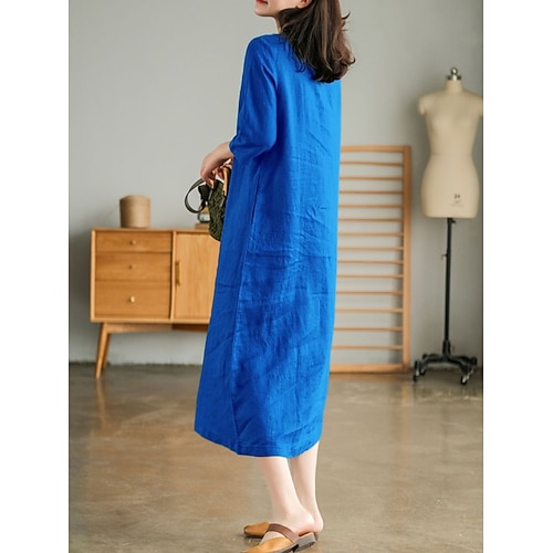 Per donna Abito Midi Abito in cotone e lino Moda Classico Moderno All'aperto Vacanza Ferie Vestibilità regolare Semplice Manica 3/4 Scollo a V Nero Verde militare Arancione Blu scuro Estate