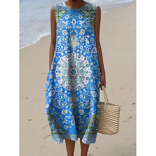 Per donna Abito Midi Abito a Tubino Vacanza Casual Uscire Vestibilità regolare Grafico Geometrico Senza Maniche Girocollo Blu Rosso Arancione Verde Estate Primavera