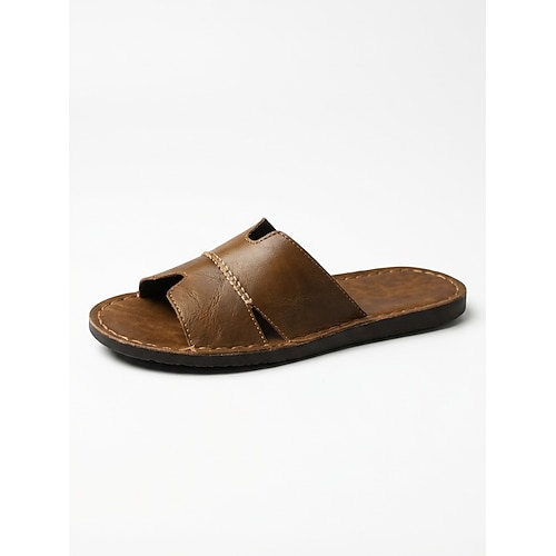 sandali da uomo in similpelle marrone, tomaia cucita a mano, plantare comodo, stile casual rilassato, adatti per il tempo libero estivo e per l'uso interno