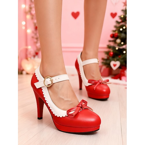 scarpe col tacco alto da donna in vernice rossa e bianca – eleganti dettagli con fiocco e tacco a blocco, perfette per San Valentino, eventi formali e occasioni speciali